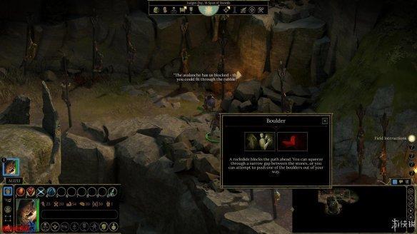 二、在沿着小路前进,遇到一块石头,可以选择直接爬过去或是推开石头。推开石头(具有角色属性要求)则会直接压死最近的一名叛军。通过石头之后继续进入战斗。地面上发出微弱光的尸体上可以搜刮一些道具。