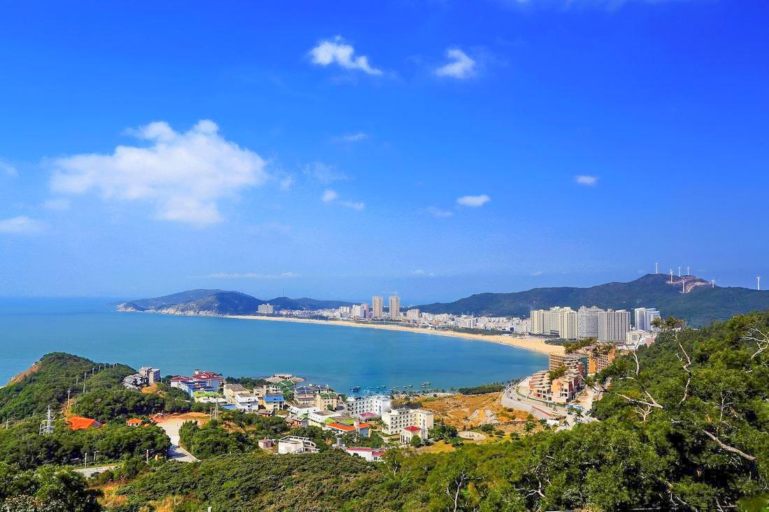 美丽的大角湾滩长2.45公里,宽50~60公里,螺线形湾似巨大的牛角,故名大角湾。山与望寮岭拱卫,湾内风和浪软,峰顶时有云雾缭绕,正所谓山无水不秀,峰无云不媚,景观层次丰富。