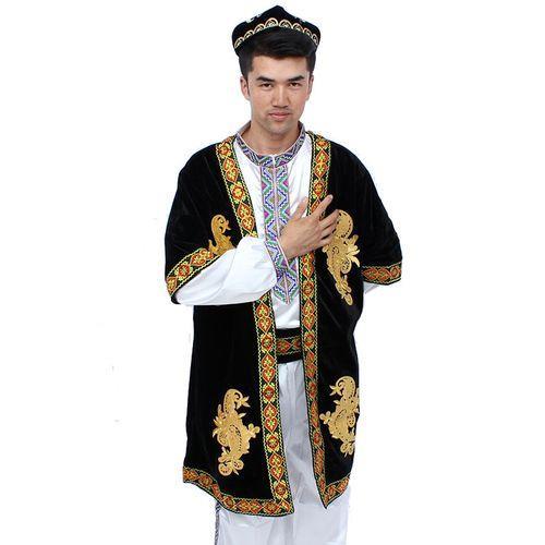 男装比较简单,主要有雅克特(长大衣)、托尼(长袍)、派西马特(短大衣)、尼姆恰(外套)、库内克(衬衫)、腰围等维吾尔族人统称外衣为玉环。男装上也绣有图案,主要在领子、胸部和领口处,显示出维吾尔族丰富的装饰美。它不仅优雅又时尚,而且穿起来也很方便。配以蓝色长裤和皮靴,融入丰富的民族服饰特色,充分展现青春活力和健身精神。