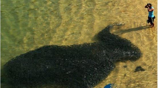 海域出现了大量鱼类聚集的场景,看起就像原油泄漏。