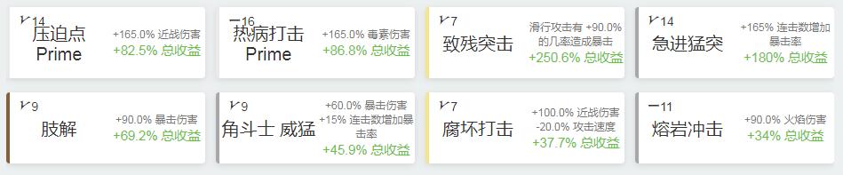武器可以分为四大类配法:纯基伤、暴击流、触发流、双修值得一提的是,最优秀的武器配装(前提是武器的白板属性允许)往往是双修配法,即暴击流和触发流同时运用。这种情况往往以腐蚀元素为主,削减敌人护甲的同时利用暴击打出高额伤害。