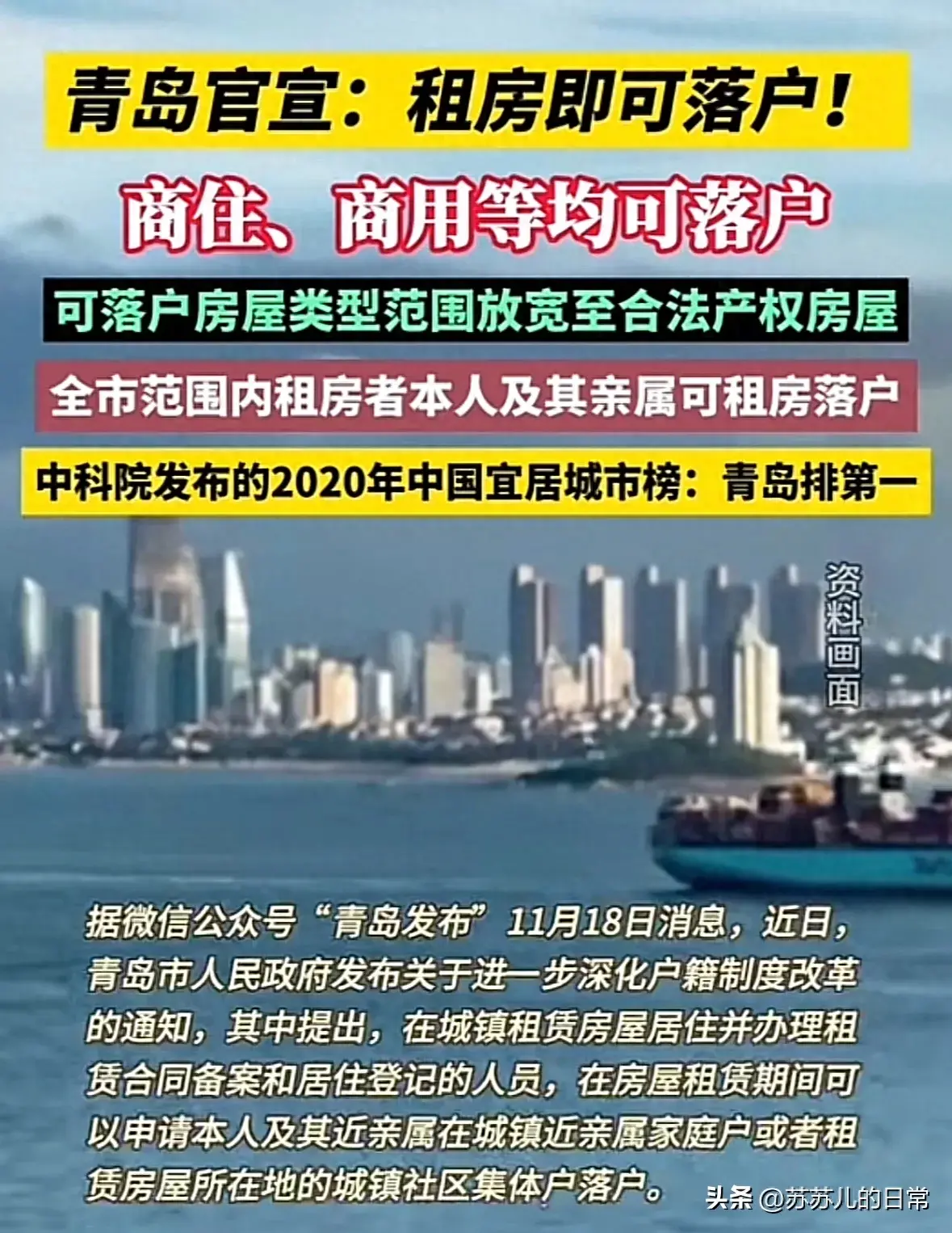 青岛官宣:租房即可落户!商住、商用等均可落户,可落户房屋类型范围放宽至合法产权房屋,全市范围内租房者本人及其亲属可租房落户。