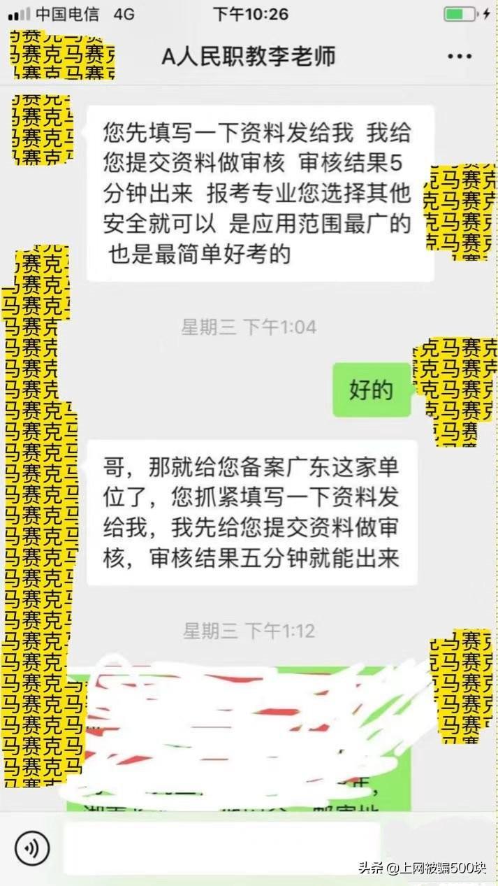 我先于5月16日交了600元所谓的“审核费”后,对方让我付班级尾款,不交就不停电话骚扰催付尾款,还谎称能兼职赚钱,根本没审核我的资格(我不是安全相关专业而且无相关工作经验)就说我可以报考,我后来在频繁的信息轰炸下交了7480元尾款,报了无忧班,报了后越想越不对劲,在网上搜索了一些新闻发现也有类似的经历的报道,感觉自己被骗,要求退款对方百般拖延,我只听了不到30分钟的免费体验课程,最后只答应退款2500多元,还要走公司的流程申请退款,审核通过后才能退。离了个大谱。