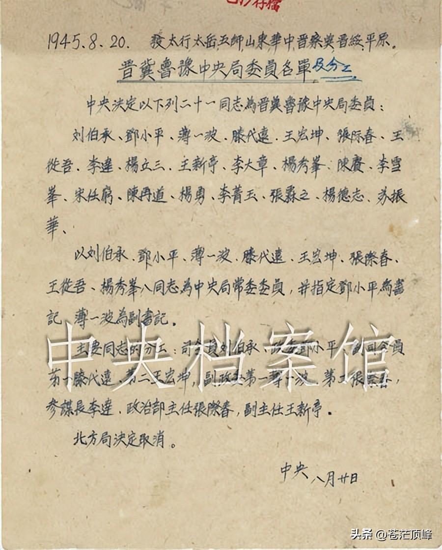1945年8月20日,中共中央关于晋冀鲁豫中央局人员组成名单的电报