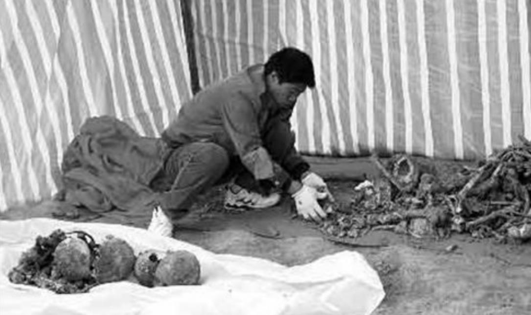 这时一名警察发现,一颗梨树下面竟立着一块陵碑,他们立刻开始了挖掘工作,这一挖直接将几具尘封多年的尸体,从土里挖了出来。