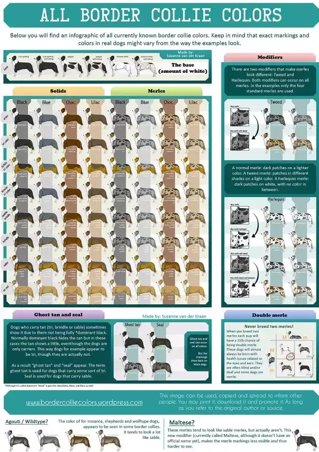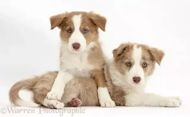 小狗从母亲继承一半DNA,另一半来自父亲。狗的表现型取决于从父母那里继承而来的DNA的组合,而DNA的组合是无穷无尽的,所以每一只小狗都是独一无二的。在边境牧羊犬身上,很多基因相互作用形成不同的颜色组合,最基本的有这几个: