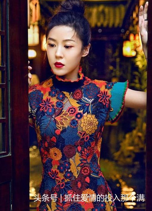 李金铭穿上这种改良旗袍更加有女人味,颜色深沉,缀满了精美的印花,做工很细腻,花案带着中国风情怀,贴身的设计勾勒玲珑曲线,高扎的丸子头凸显典雅的气质,很迷人!