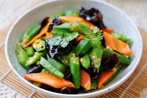 先把秋葵清洗干净,焯水十几秒,捞出来晾凉一下,去掉头和尾,切成小段备用;木耳提前泡发清洗干净,焯水2分钟左右捞出来沥干水份备用;胡萝卜去皮后切成薄片,可以焯水一下也可以直接加在碗里,把所有食材放在大碗中备用;蒜切末放在碗中,浇上一勺热油,加入生抽、盐、米醋,用适量清水稀释一下,搅拌均匀,浇在秋葵碗中,拌均匀就可以吃了!超级的开胃好吃,一定要试试!