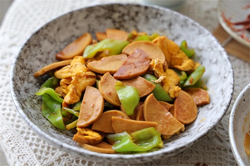 素鸡切成薄片,青椒切成小块,鸡蛋提前炒散盛出来备用。另起锅加点植物油,把蒜片倒进去炒出香味,再把青椒素鸡加进去翻炒均匀,加入盐、生抽、老抽、蚝油、米醋调味翻炒均匀,把鸡蛋加进去翻炒均匀,最后淋入小半碗水淀粉,来个薄薄的芡汁,味道更好一些。