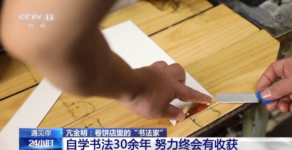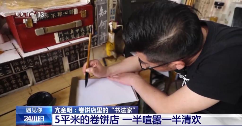 在安徽合肥有一家小小的卷饼店,过去 30 年间,老板亢金明一边卖卷饼,一边坚持练习书法。因为字写得好,大家都称他为——卷饼店里的 " 书法家 "。