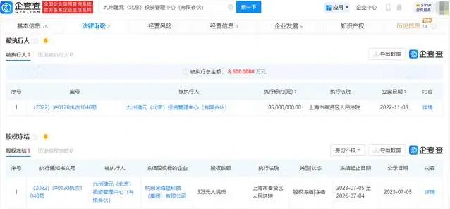 企查查 APP 显示,近日,九州建元(北京)投资管理中心(有限合伙)新增一则股权冻结信息,冻结股权标的企业为杭州米络星科技(集团)有限公司,股权数额为 3 万元人民币,上海市奉贤区人民法院为执行法院。