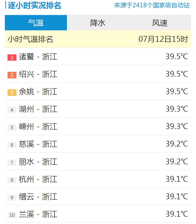 截至 12 日 15 时,全国气温实况排行榜前十,浙江继续霸榜。与 14 时相比,东阳和武义掉出了前十,诸暨、绍兴、余姚则以 39.5 ℃并列第一。
