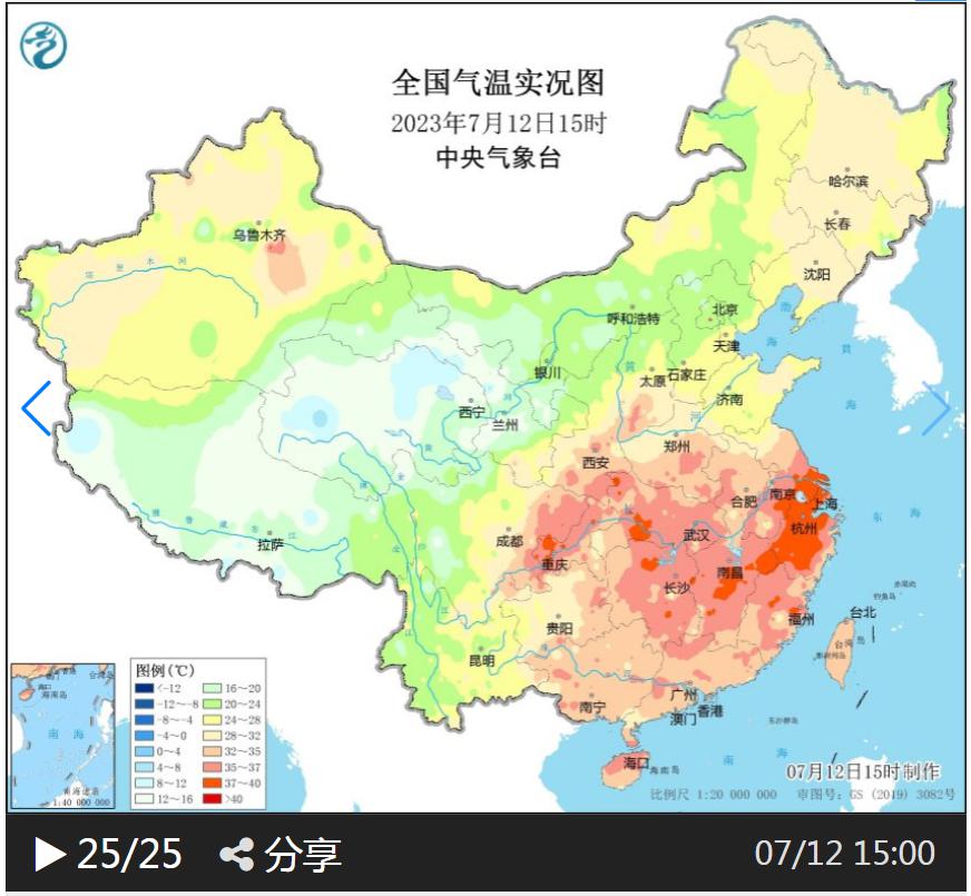 7 月 12 日中午,杭州发布今年首个高温红色预警。而在全国气温实况排行榜上,浙江的城市包揽了高温榜前十。