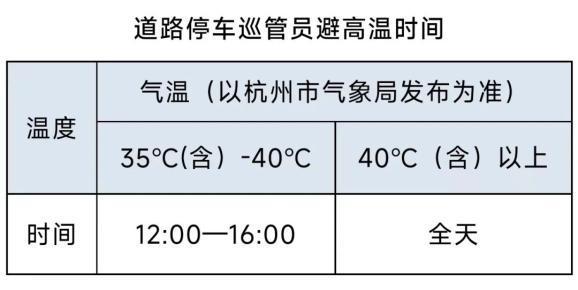 根据《关于做好道路停车巡管员防暑降温工作的通知》要求,日最高气温达到 40 ℃以上的(以杭州市气象局发布为准),应停止室外露天作业;日最高气温达到 35 ℃以上、40 ℃以下的,应按规定减少高温时段室外作业,适当增加巡管人员的休息时间,严禁延长高温作业时间和违规加班加点。