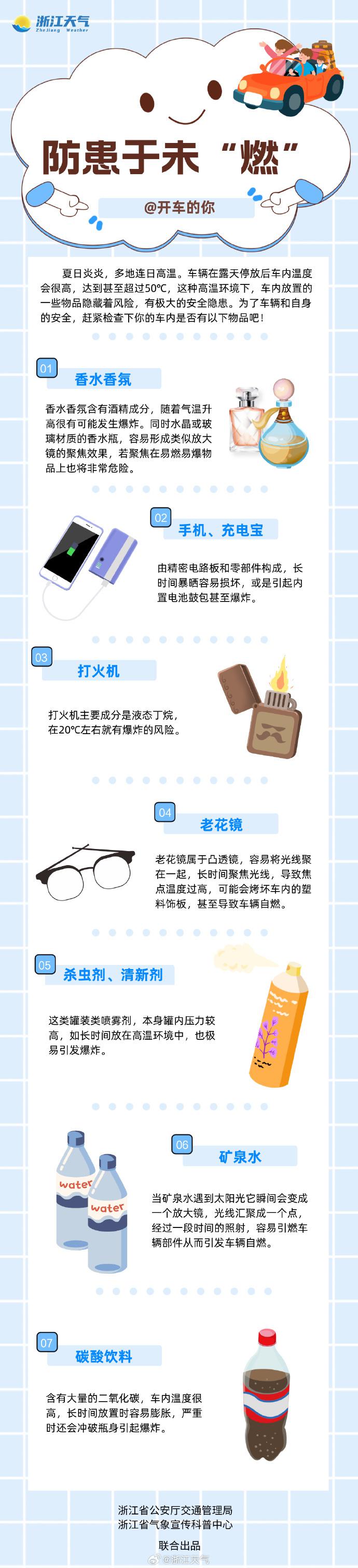 对此,@浙江天气 12 日发文称,最近高温预警满天飞,车辆露天停放车内温度可能超过 50 ℃,赶紧检查一下你车里有没有这些东西:
