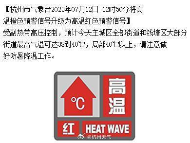 7 月 12 日中午,杭州发布今年首个高温红色预警:受副热带高压控制,预计今天主城区全部街道和钱塘区大部分街道最高气温可达 38 ℃ -40 ℃,局部 40 ℃以上。
