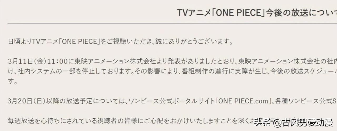 首先确定消息,海贼王动画延期停更是真的,东映动画针对此事做了宣告,公司网络受到第三方攻击,暂停对网络进行调查。漫画也有可能受到影响休刊。