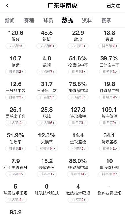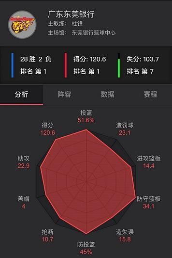 广东队本赛季延续上赛季的快打旋风,小球打法快马弯刀卷狼烟,进攻如惊涛狂拍,防守似金城汤池,30轮常规赛场均狂轰120.6分,列联盟榜首;回合数(95.2)、快攻得分(15.2)、投篮命中率(51.6%)和进攻效率(127.3)等均名列联盟榜首;助攻(22.9)、三分球命中数(12.6个)和命中率(39.7%)、篮板(48.5)、防守效率(109.1)都是位居联盟第。全队攻防人如龙,马如虎,战必胜、攻必克。破新疆,败辽宁,斩山东、挑北京……横刀四顾笑傲联盟。