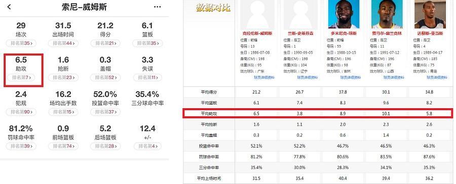 本赛季威姆斯场均助攻高达6.5次,全联盟排名第七。在出战时间最少(31.5),球权最少的情况下,和师弟(35.4分、3.8次)、琼斯(40.4分、8.9次)、富兰克林(39.4分、10.1次)和亚当斯(36.2分、5.8次)等顶级锋卫相比,也毫不逊色,甚至更高效。在今年广东队主场对阵深圳队的"元旦同省德比战"中,威姆斯出战28分钟,砍下8分并送出17记助攻,化身助攻大师。