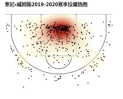 从威姆斯的投篮热图看,他的攻击点遍布每一个进攻区域,可谓进攻无死角,而泛着血色的篮筐区则最为高效,作为锋线球员,说明快攻和突破得分是何等的犀利。