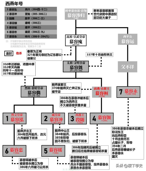 394年被后燕开国皇帝慕容垂所灭,历经七主,国祚共十年。