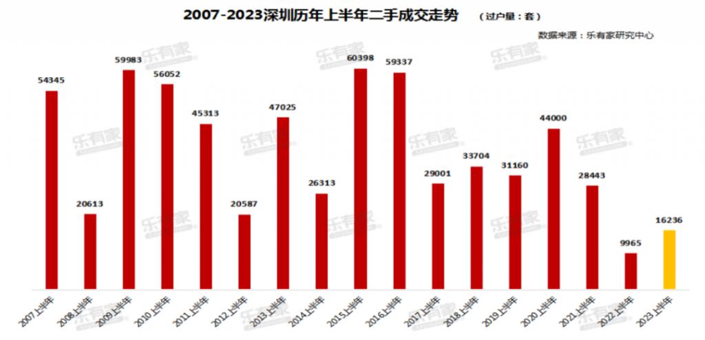 乐有家数据显示,2023 年上半年,深圳二手住宅过户量达到 16236 套,虽然二手房成交情况同比 2022 年同期是上涨的,但相比 2020 年上半年 4.4 万套的成交,2021 年上半年 2.8 万套的成交,仍然处于低位。