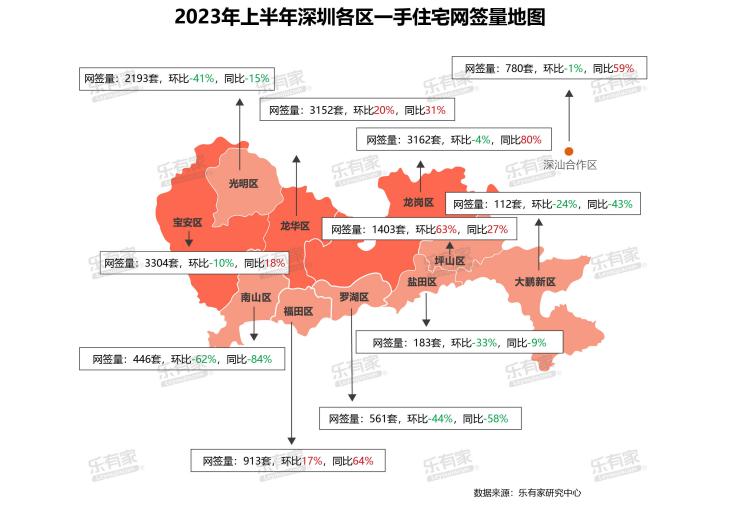 据乐有家,深圳目前新房网签套数较为集中的片区,主要集中在宝安、龙岗和龙华,今年上半年网签套数均在 3000 套以上。