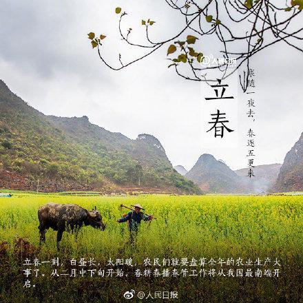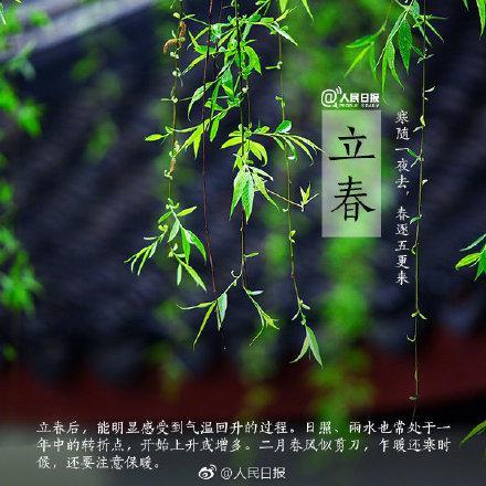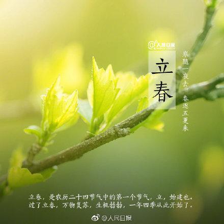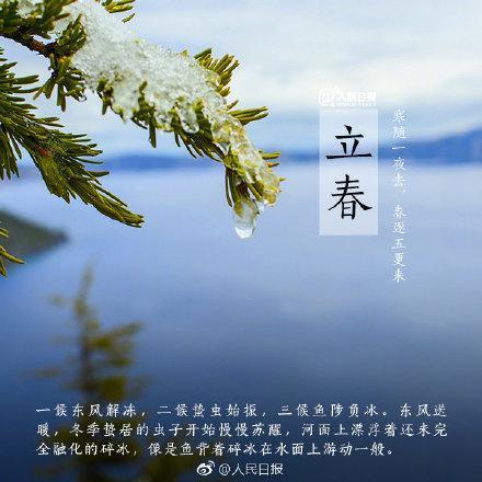 【除夕当天巧逢立春,百年内只有三次】除夕和立春正巧在同一天,这种情况并不常见,百年内还有2057年2月3日,2076年2月4日。而2038年2月4日、2087年2月3日这两天,都是大年正月初一立春。立春当天,吃春卷、春饼谓之“咬春”,寓意来年风调雨顺、春风得意。你家今晚的年夜饭,安排了吗? @人民日报:【今日,立春】今日11时14分,将迎来二十四节气中的第一个节气——立春。“律回岁晚冰霜少,春到人间草木知”,从今天起,万物复苏,一年四季从此开始。一候东风解冻、二候蛰虫始振、三候鱼陟负冰,尽管极寒的日子并未远去,但温暖已不会太远。一年之计在于春,愿你不负春光,不负梦想!