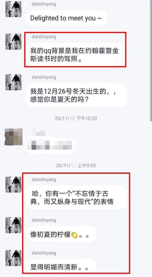 小张提供的QQ聊天记录截图显示,杨某军仅仅在图书馆搭讪小张后的第二天,就在QQ中给她发送了“你有一个不忘情于古代,而又纵身于现代的表情,像初夏的柠檬,显得明媚而清新”这样的消息。