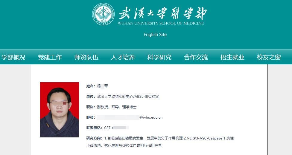 记者在武汉大学医学部官网上查阅到涉事教师杨某军的信息。该页面显示,杨某军的单位为武汉大学动物实验中心(据武汉大学动物实验中心官网显示,该实验室为生物安全三级动物实验室,简称A3实验室)。杨某军职称一栏写道:副教授,硕导,理学博士。