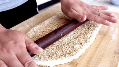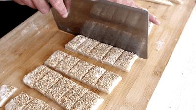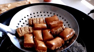 要做好表皮,酥皮,蜜汁,然后卷成薄片,切成小块,撒上芝麻,放入油锅中炸。用于制作蜜三刀的糖是麦芽糖,所以如果你想在家学习如何制作它,你应该买淡黄色或黄色的麦芽糖,一定不要忽视这一步哦。