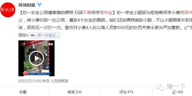初一学生、女、不帮写作业、围殴、裸照、罚款这几个关键词,任谁看了这篇报道都不能淡定。