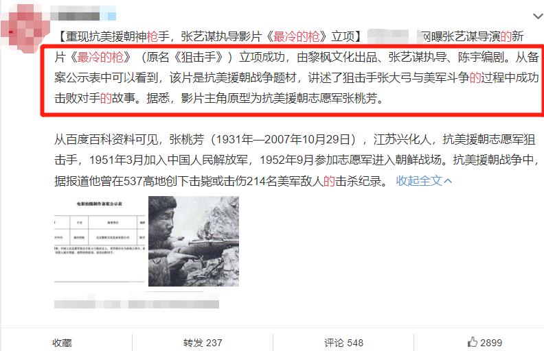 张艺即将来袭的这部新电影就是《最冷的枪》,这部电影也是《坚如磐石》的编剧陈宇再次创作,而且这部电影跟前三部电影还是很不一般的,这部电影是一部战争题材的电影,而且还是以历史人物原型塑造。