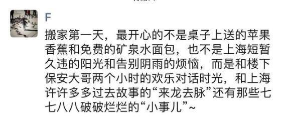 在截图中,疑似蒋劲夫称“搬家第一天,最开心的不是桌上送的苹果香蕉和免费的矿泉水面包,也不是短暂久违的阳光和告别阴雨的烦恼,而是和楼下保安大哥两个小时的欢乐对话时光,和上海许许多多过去故事的来龙去脉还有那些七七八八破破烂烂的小事儿”