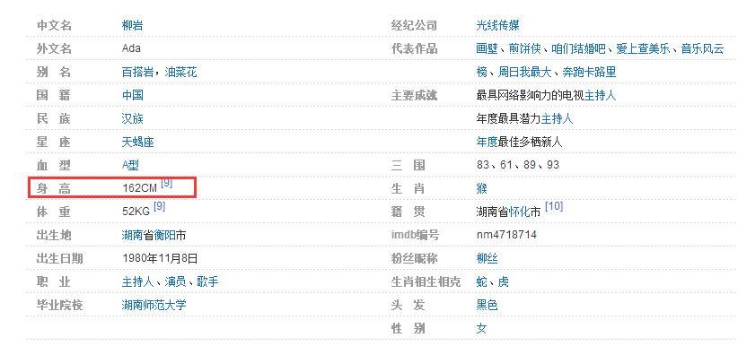 而在咱们结婚吧19集时,高圆圆穿了高跟,目测起码增高7厘米,但是柳岩知道高圆圆眼睛那块,也就是说,两人相差最少7厘米,柳岩穿了平底鞋算作2厘米吧,已知刚才推算高圆圆160,160+7厘米鞋跟=167,167-7厘米差距-2鞋跟=158cm。