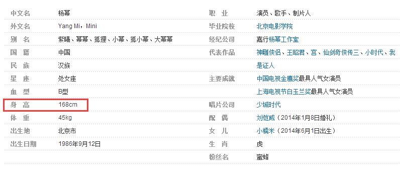 已知杨幂百科的身高168,而刚才推算的阿娇的身高为155,那么两人起码相差13厘米,也就是说,如果两个人站在一起,那么阿娇应该才到杨幂嘴巴那里,但是,在下图中可以明显看出阿娇这回是没有垫垫子的,而此时的杨幂也就高了阿娇一丢丢,就算算作高了5厘米,155+差距5厘米=160,如果算上肉眼差,杨幂的身高应该是160-163之间。