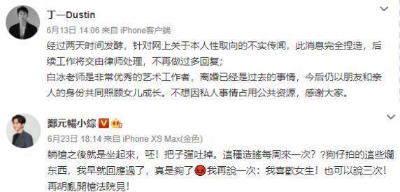 此时的白冰还在出面维护老公,称相信对方绝不是那样的人,自己无条件信任丈夫,信任孩子的父亲。而郑元畅也火速发文极力否认,称大家是什么样的人就以为看到的是什么。而丁一也否认骗婚一事。