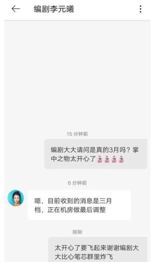 过审之后便是定档了,自2019年4月17日《掌中之物》正式杀青后,剧粉们都要定期询问:这部剧到底什么时候播?而《掌中之物》的关联话题除了原著小说热度最高之外,便是播出时间最受关注。日前就有粉丝终于按耐不住等待的心情,询问编剧李元曦该剧的播出时间。根据网友的询问截图,疑似编剧回应该剧将在3月左右播出,目前正在做剪辑上的最后调整。
