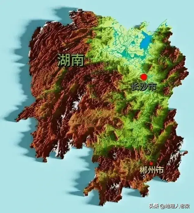 湖南省地形图。湖南省呈三面环山、朝北开口的马蹄形地貌,地跨长江、珠江两大水系