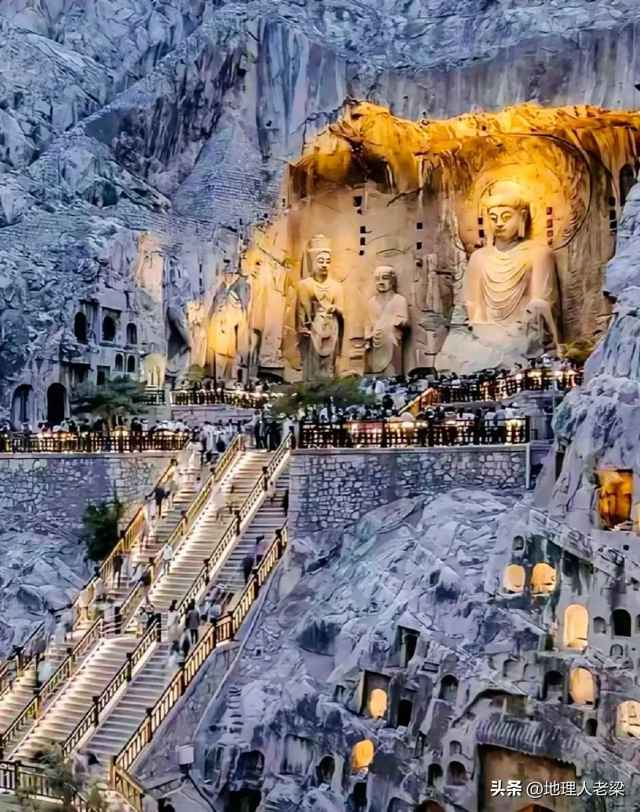 龙门石窟位于伊河两岸,东、西二山对峙,伊水从两山中间流过