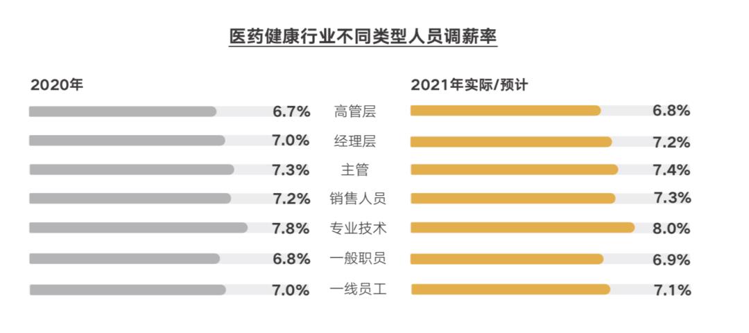 因此,中智咨询调研得出,2020年医药健康行业整体受疫情利好影响,调薪计划受疫情影响较小,2020年平均调薪率为 7.2%,2021年预计调薪率为7.4%。