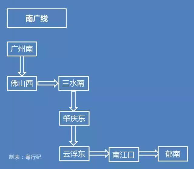 南广线途径广州、佛山、肇庆、云浮,从广州南站搭高铁至佛山西站仅需 19 分钟,至肇庆东站 35-42 分钟不等,至云浮东站 57-69 分钟不等。
