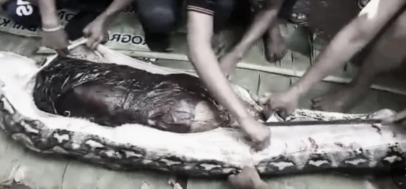 村民们应声来到山坡上,手拿猎枪的一个村民朝大蟒蛇头部连开数枪,大蟒蛇很快毙命。人们拿来刀子把蛇从腹部剖开,死者救出来了,但头部已部分被蛇的胃液溶蚀,没活下来,惨不忍睹的一场蛇吃人的悲剧……