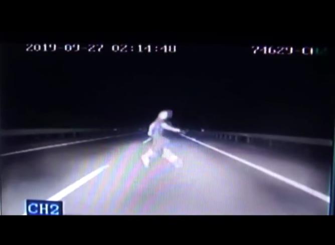 大货车的行车记录仪完整记录下了事故瞬间:凌晨两点十五分,高速公路上车辆很少,光线也很暗,突然从隔离栏位置冲出一名身穿深色T恤的男子,低着头跑过高速公路,大货车司机发现时刹车已经来不及,车头右侧和男子发生了碰撞,将男子撞飞。