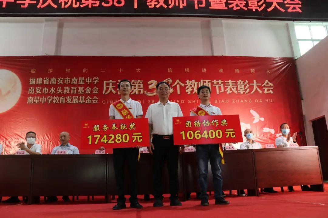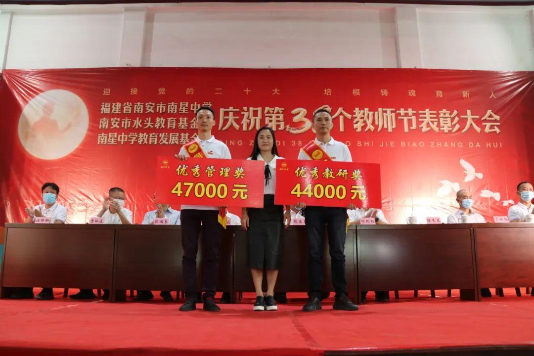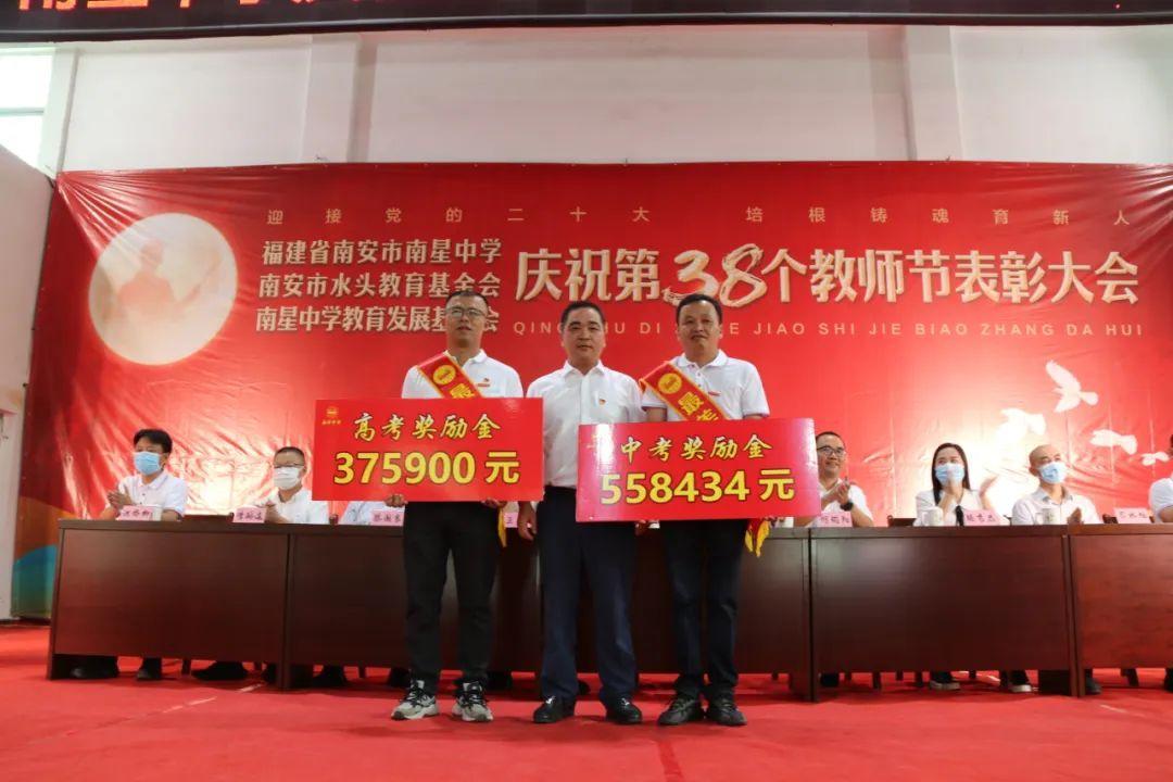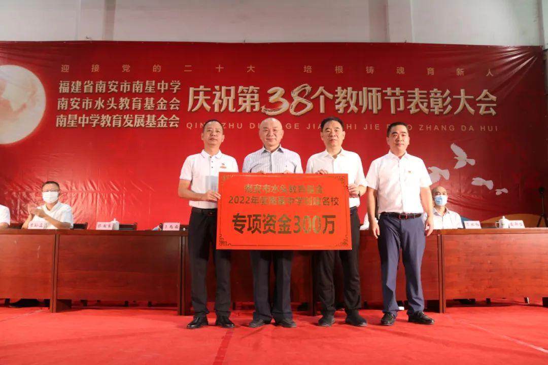 表彰大会上,南安市水头教育基金会向南安市南星中学教育发展基金会颁发2022年度南星中学创建名校专项资金300万元。