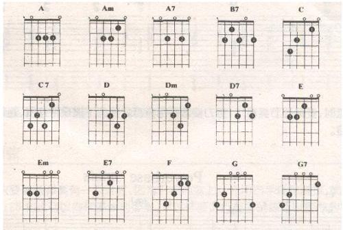 今天教大家和弦谱,那什么是和弦谱呢,就是大家在看吉他弹唱的时候,看到六线谱上方会有图示一般上面会写B C D Bm之类的,那么这个就是和弦谱了!!那么和弦谱子怎么看呢? 看下图: