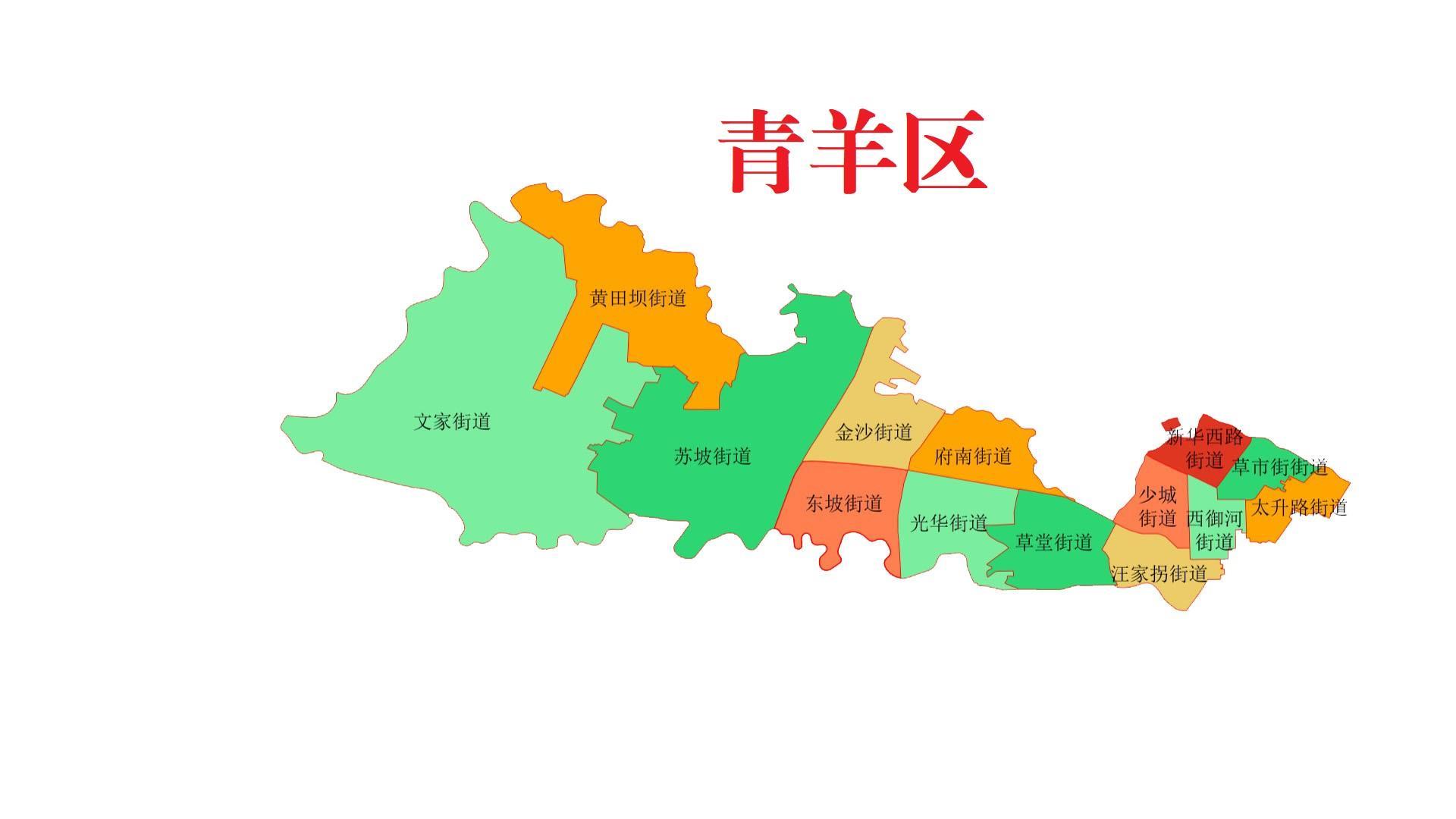 青羊区总面积66平方千米,下辖12个街道,即草市街街道、少城街道、府南街道、草堂街道、西御河街道、黄田坝街道、蔡桥街道、光华街道、金沙街道、苏坡街道、文家街道、康河街道。截至2022年末,青羊区常住人口96.7万人。