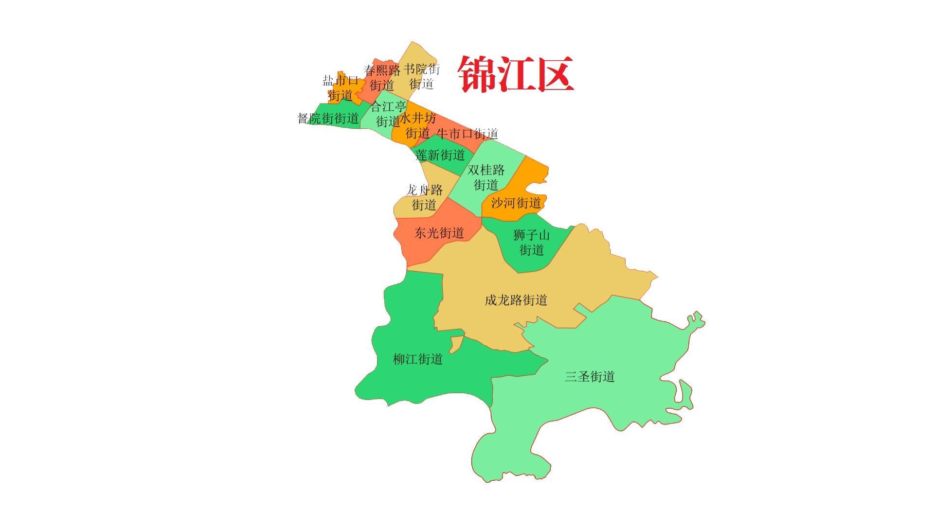 锦江区总面积62平方千米,下辖11个街道,即成龙路街道、沙河街道、柳江街道、三圣街道、狮子山街道、锦官驿街道、东湖街道、春熙路街道、书院街街道、牛市口街道、锦华路街道。截至2022年末,锦江区常住人口91.44万人。