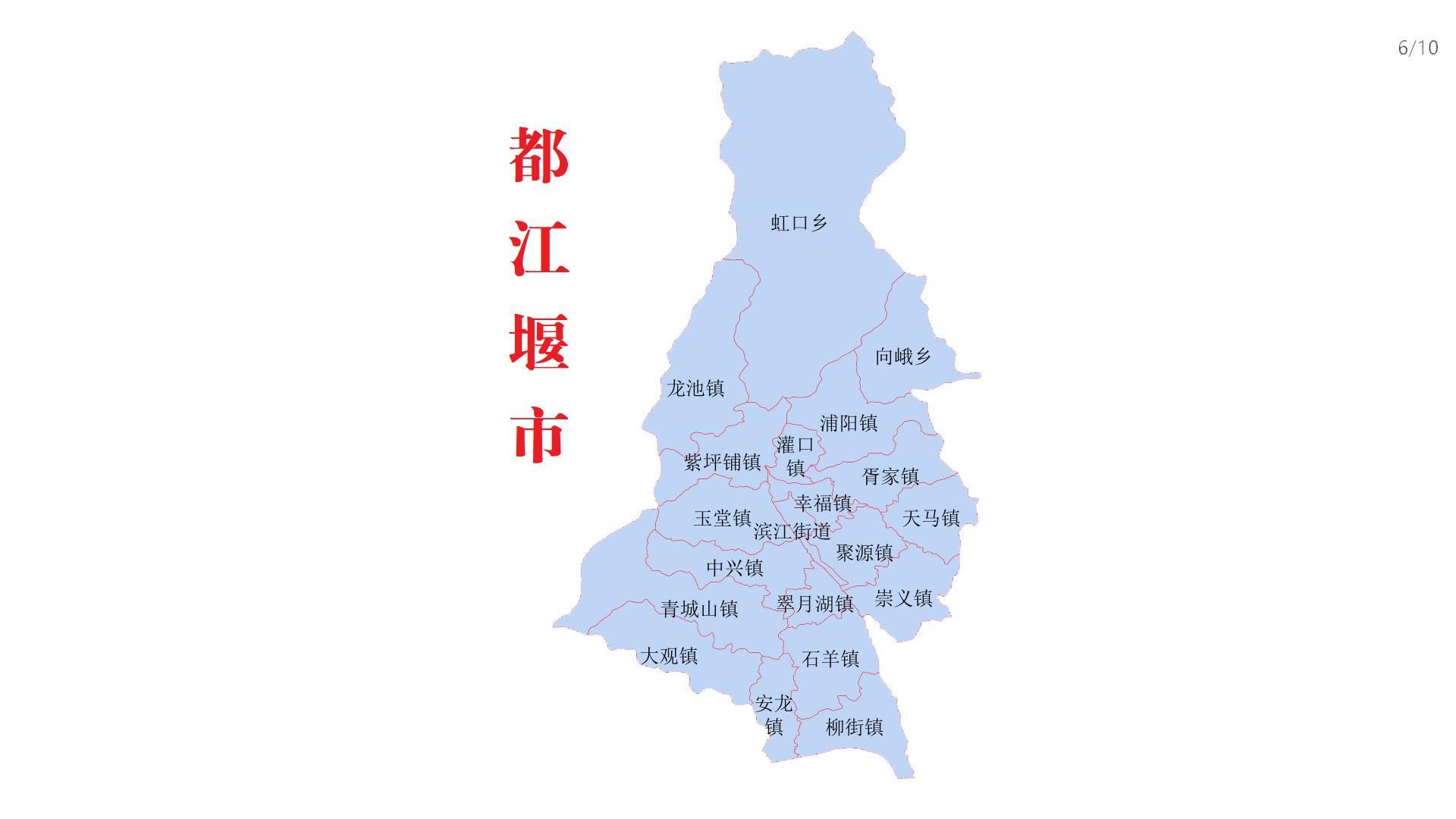 都江堰市总面积1208平方千米,辖6个街道(灌口街道、幸福街道、玉堂街道、蒲阳街道、银杏街道、奎光塔街道)、5个镇(石羊镇、龙池镇、天马镇、青城山镇、聚源镇)。截至2022年底,全市常住人口71.46万人。