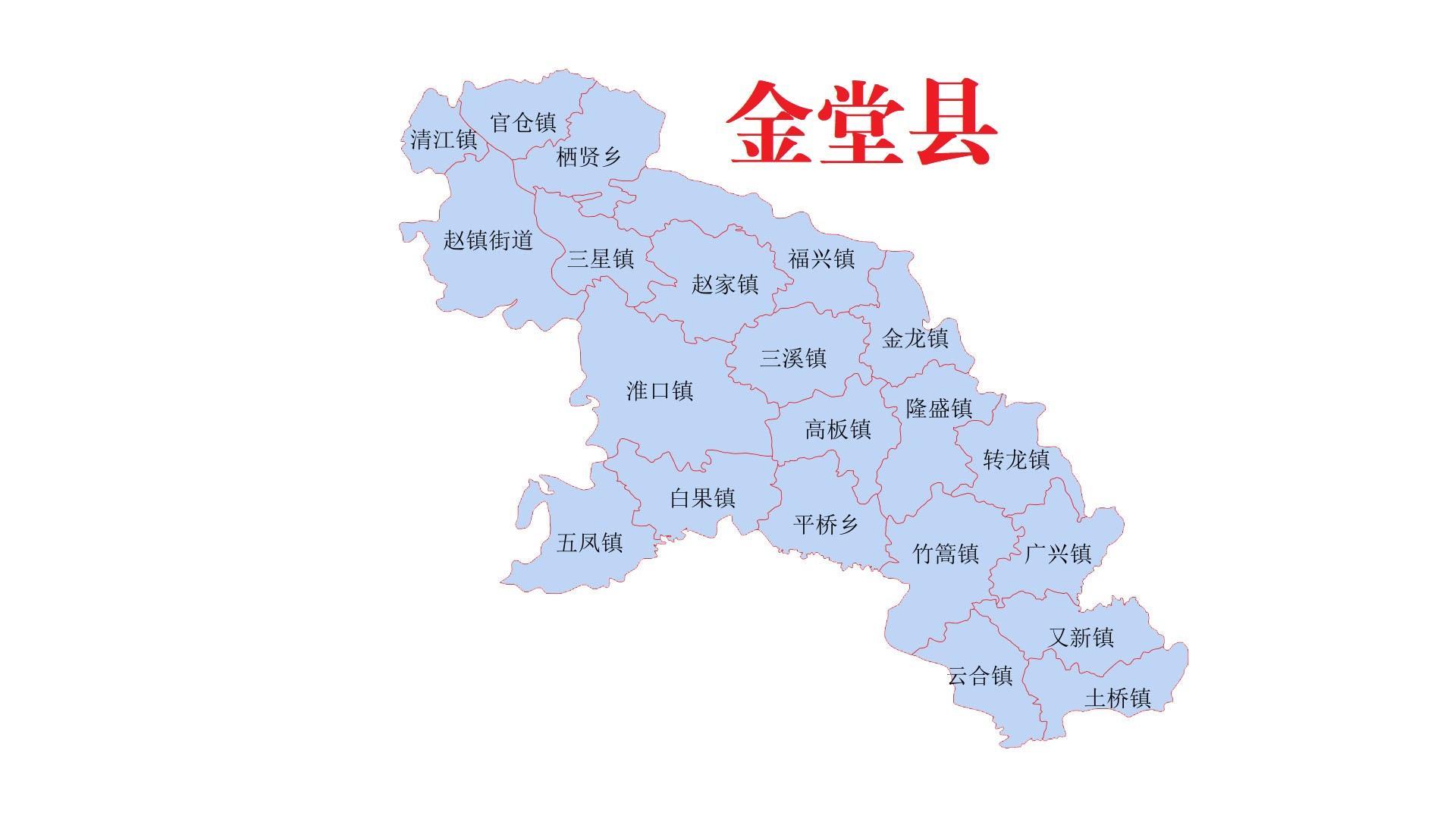 金堂县总面积1155.62平方千米 ,下辖6个街道(赵镇街道、淮口街道、官仓街道、栖贤街道、白果街道、高板街道)、10个镇(赵家镇、金龙镇、又新镇、云合镇、五凤镇、竹篙镇、福兴镇、土桥镇、转龙镇、三溪镇)。截至2021年末,金堂县户籍总人口90.4万人。